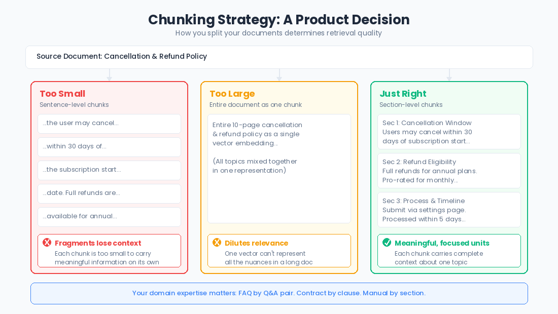 This is a product decision, not just a technical one. You need to understand your content well enough to know what constitutes a meaningful unit. For a FAQ, each question-answer pair is a natural chunk. For a legal contract, maybe it's clause by clause. For support documentation, it might be section by section. Your domain expertise matters here.