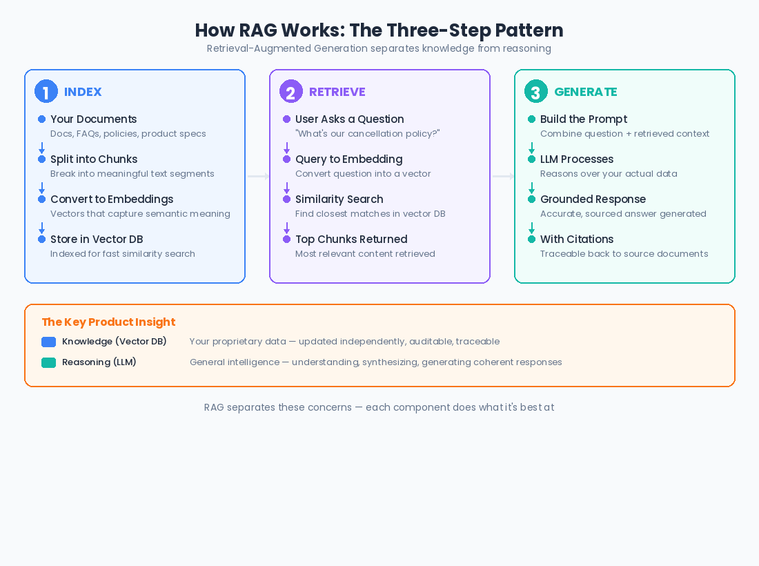 Retrieval-Augmented Generation. It's a mouthful, but the concept is elegant and it's probably the most important architectural pattern for product teams building with LLMs right now.