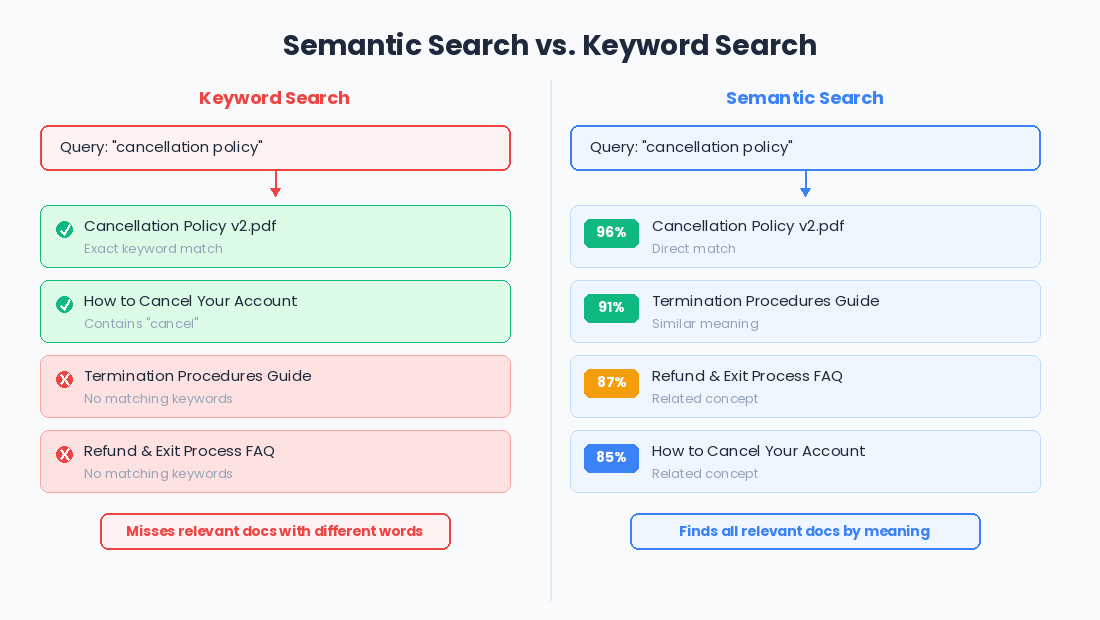 Traditional search is keyword-based. If a user searches for "cancellation policy" and your document says "termination procedures," keyword search misses it. They're different words. But their embeddings? They're close together in vector space, because the