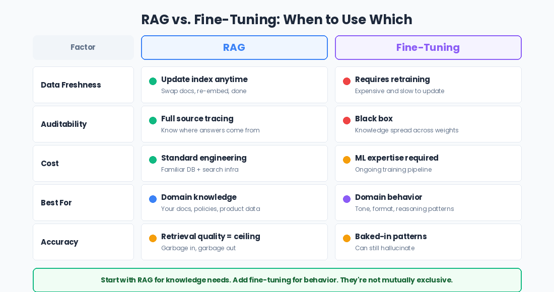 Cost and maintenance. Fine-tuning a model is expensive and requires ML expertise. Maintaining a RAG pipeline is engineering work, but it's more traditional engineering work involving indexing documents, managing a database, and tuning search relevance. Most product engineering teams can build and maintain a RAG system. Most cannot maintain a fine-tuning pipeline.