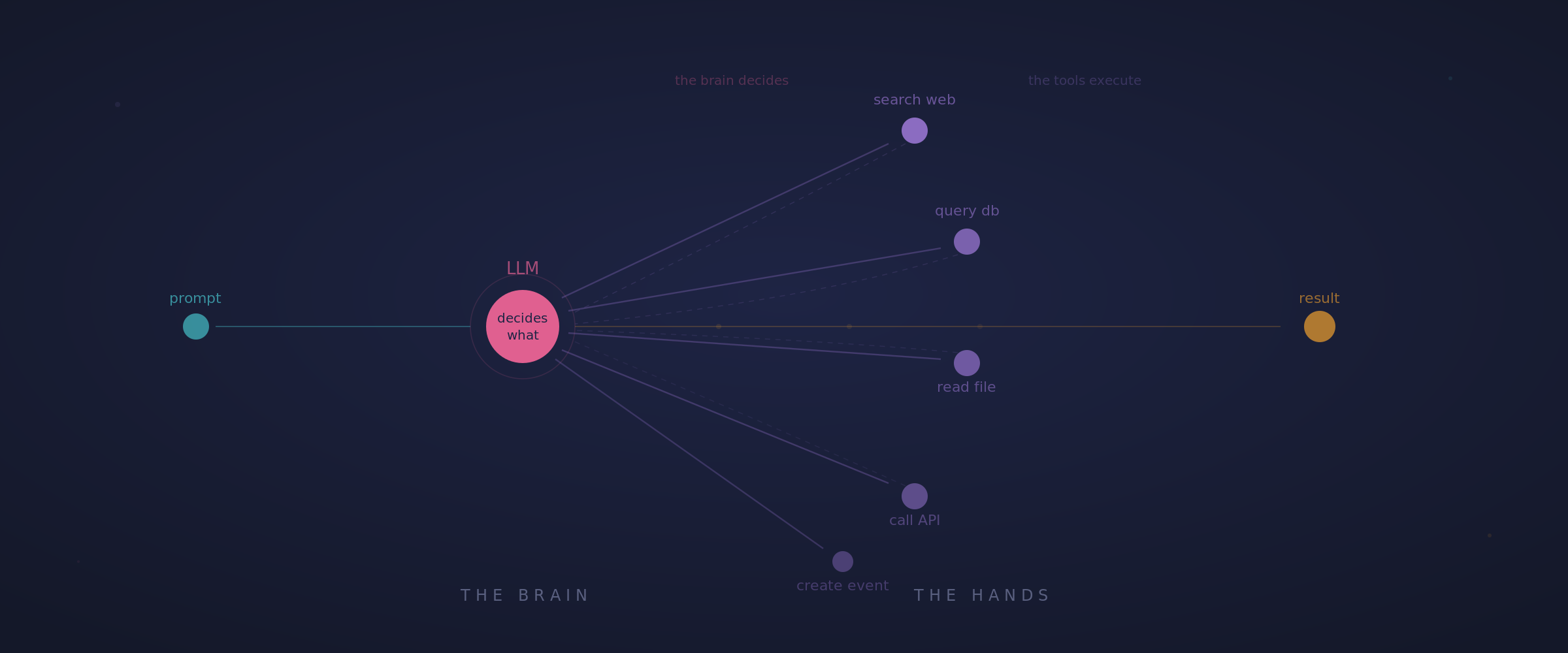 This is the unlock that turns a text generator into something that interacts with real systems. Think of the LLM as the brain and the tools as the hands. The brain decides what to do. The hands do it. Without tools, you've got a brain in a jar: impressive reasoning ability, but no way to change anything in the real world.